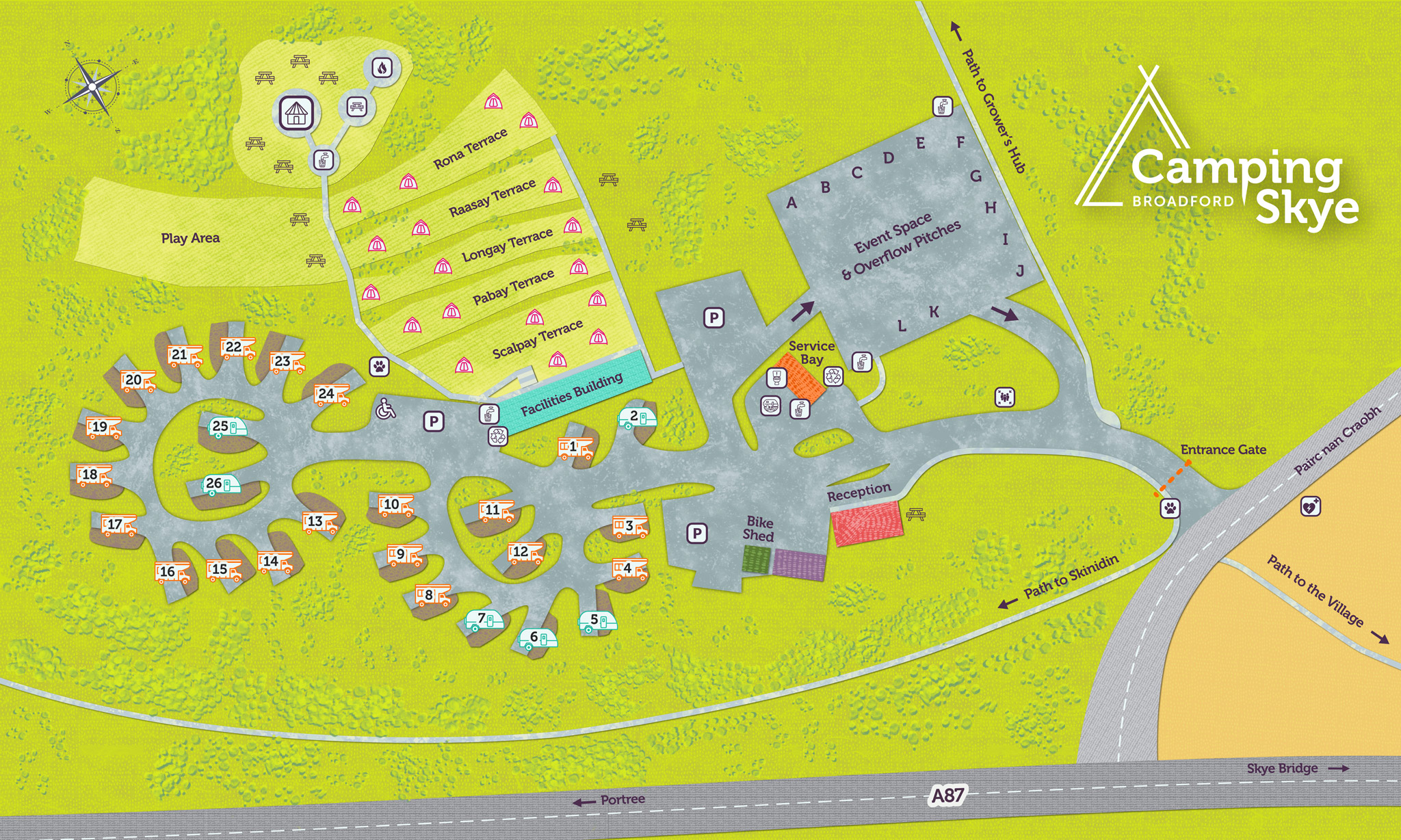 The motorhome and caravan hard-standing pitches (1 to 26) have 240V/230V 16A electric hook-up and individual picnic/awning areas. Rock pegs are advised for your awning.